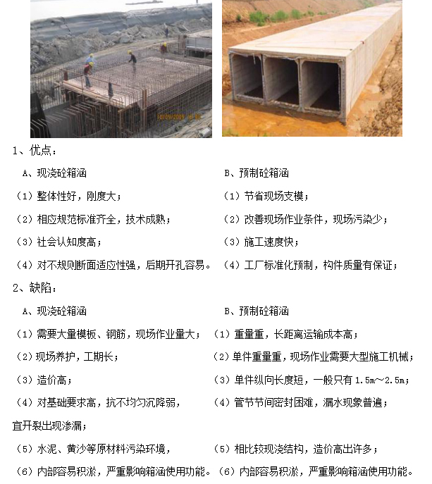 由鋼筋混凝土或圬工材料制成箱形管節(jié)的涵洞,可用來輸水、排水、蓄水、行洪,過人及車輛通過。箱涵施工一般采用現(xiàn)澆,也有部分采用預(yù)制砼。其優(yōu)缺點(diǎn)如下: